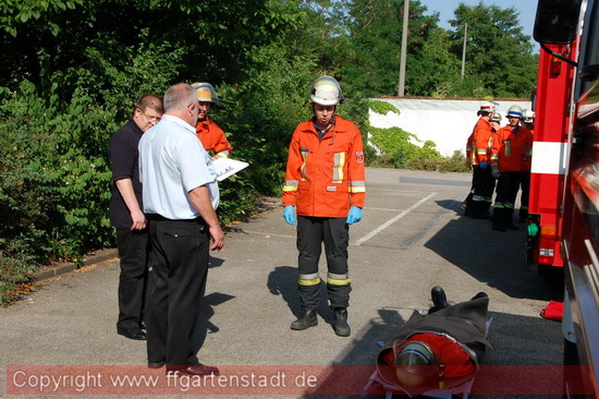 Entsprechend dieser Einsatzlage wird zunächst eine Verkehrsabsicherung erstellt. Parallel dazu erfolgen die Ausleuchtung der Unfallstelle sowie Erstbetreuung der Person im Fahrzeug durch die Feuerwehr. Des Weiteren wird der Brandschutz mittels Schnellangriffsrohr und Pulverlöscher sichergestellt. Nach der Bereitstellung aller Rettungsgeräte auf der entsprechenden Geräteablage wird der Befehl zur Befreiung der eingeklemmten Person gegeben.