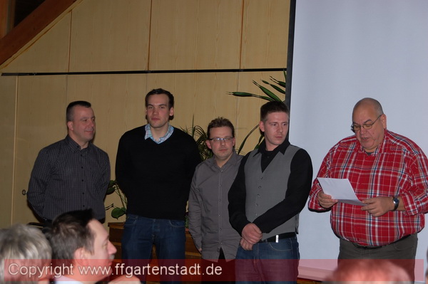 Günter Papak hielt als Löschzugführer einen kurzen Rückblick über das dienstliche Jahr 2010. Aus der Vielzahl an Einsätzen hob er besonders die notwendigen Tätigkeiten im eigenen Stadtteil hervor. Die Schneeschmelze nach starkem Frost im Januar sowie der Kellerbrand in der Stolzingstraße im November zeigten den Gartenstädter Bürgern was die Stadtteilfeuerwehr alles leisten kann.