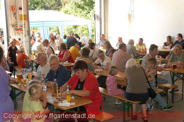Bei bestem Sonnenschein kamen frühzeitig die ersten Besucher, um sich einen Platz in der schattigen Fahrzeughalle zu sichern. Entsprechend dem Wetter gewannen die Fischbrötchen gegen Bratwurst und Steak. Die neu angebotene Schaschlikpfanne wurde von vielen Anwesenden probiert. Der mit dem heißen Wetter verbundene Flüssigkeitsbedarf trieb den Absatz an Getränken in die Höhe. Kaffee und Kuchen gab es wie üblich bis zum Spätnachmittag.