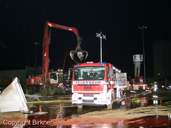 Bei der ersten Erkundung vor Ort zusammen mit dem Zugführer der Feuerwache 4 wurde ein brennender Metall- und Schrotthaufen im Außenbereich in unmittelbarer Nähe zu einem Betriebsgebäude ausgemacht. Dieser hat sich im Vollbrand befunden.
