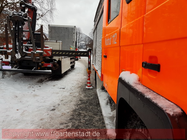 Den gesamten Dienstag nutzten wir dann als alleinige Einheit weiter an der Örtlichkeit des Vortages unser Bestes zu geben, um den inzwischen immer schwereren Schnee vom Dach zu bekommen. Hier musste noch mehr aufgepasst werden, da durch Tauwetter und Frost die Schneeschicht immer rutschiger wurde. Das etwa 200 Quadratmeter große Dach konnte dann tatsächlich zu Einbruch der Dunkelheit als abgearbeitet gemeldet werden. Bei einer Schneehöhe bis deutliche über 2 Meter bei Schneeverwehungen ist das harte körperliche Arbeit. Wir freuten uns umso mehr, als die sehr freundlichen Eigentümer uns mit Kaffee und Gebäck stärkten.