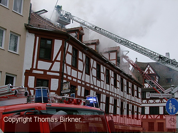 Auf Grund der beengten Lage in der Nürnberger Altstadt war es eine Herausforderung die Feuerwehrfahrzeuge zu platzieren und auch die Wasserversorgung sicherzustellen.
