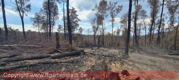 Zum Einsatz sind wir im Brandgebiet zur Lokalisierung und Bekämpfung von Glutnestern gekommen. Diese wurden mit Löschrucksäcken bekämpft. Hier kommen auch spezielle Waldbrandhacken, aber auch Schaufeln zum Einsatz. Ebenso erfolgte die Bekämpfung von immer wieder aufflackernden Feuer mit Strahlrohren.