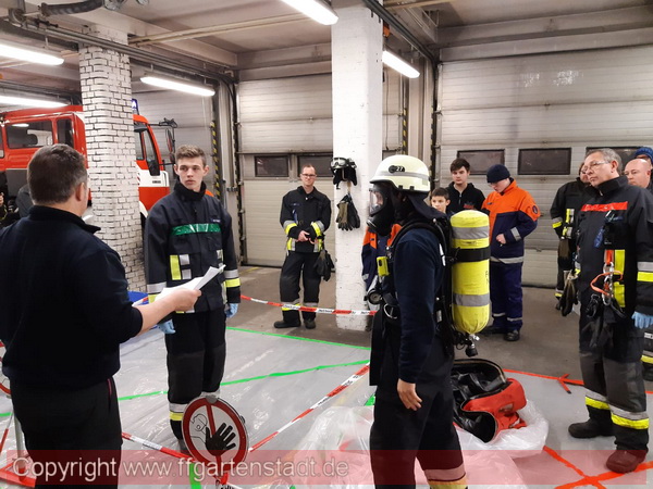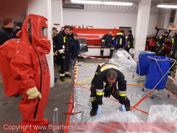 Im Februar fand eine Fortbildung hierzu statt, welche unser neuer Betreuer Gerhard Karges, als Bindeglied der Berufsfeuerwehr, gemeinsam mit uns durchführte. Als Schwerpunkt war dieses Mal der Aufbau und der Betrieb eines Dekontaminationsplatzes gesetzt. Dieser Dekontaminationsplatz ist notwendig, um eine Verschleppung von Gefahrstoffen vom Einsatzort durch zum Beispiel Einsatzkräfte zu unterbinden. Konkret bedeutet dies das Messen auf Gefahrstoffe und strukturierte Entkleiden der Feuerwehrkameraden aus ihren Chemikalienschutzanzügen.