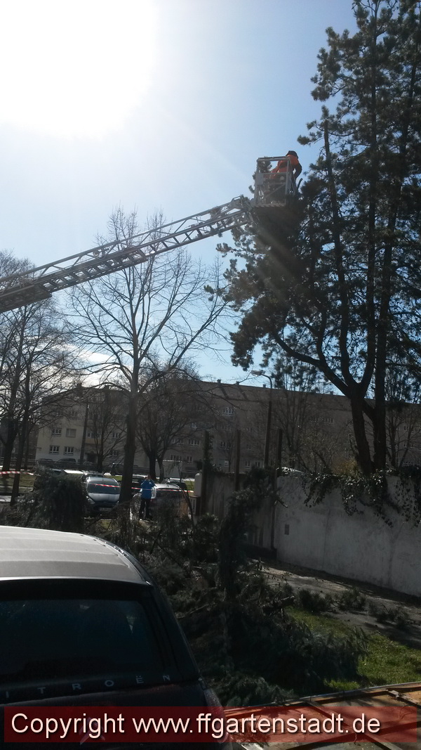 In einer Abzweigung der Allersberger Straße ergab sich folgendes Lagebild bei Ankunft der Feuerwehr Gartenstadt: Ein etwa 15 Meter großer Tannenbaum war in einem Privatgrundstück umgestürzt und lag auf der Grundstücksmauer auf. Der Baum schwebte in etwa 3 Meter Höhe ...weiterlesen